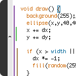 Our program is pretty complete, and just to finish our drawing, let's link the line of code that draws the ball to the our ball shape by selecting the code, clicking on the link button , and clicking on the shape. Notice that any code can be linked to multiple shapes, although each shape can only be linked to one continuous fragment of code.